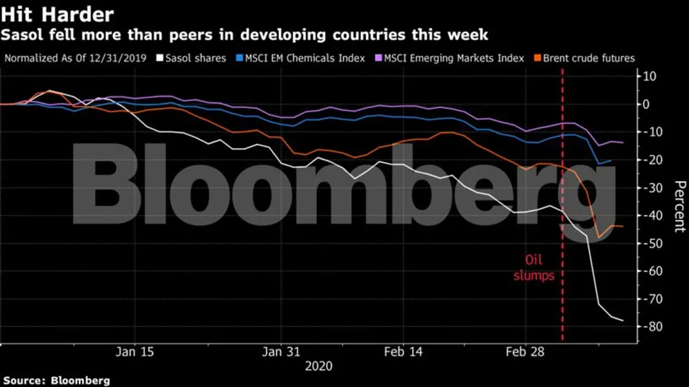 Shares in the fuels and chemicals producer, South Africa’s biggest company by sales, have lost almost 58% since the week started, the most among the 1,401 members of the MSCI Emerging Markets Index, which is down 5.3%.