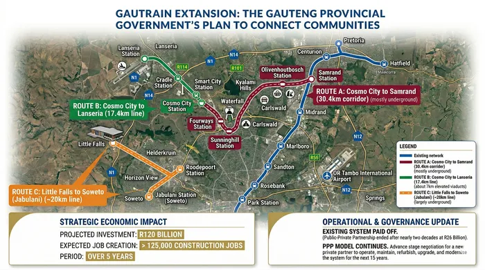 The new routes that the expansion will cover include a largely underground line linking Little Falls, Roodepoort, and Jabulani in Soweto; a corridor from Cosmo City to Lanseria Airport; and a line connecting Cosmo City to Samrand through Fourways, Sunninghill, and Olivenhoutbosch.