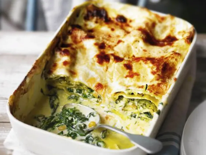 Layer up the ingredients in a buttered ovenproof dish starting with a layer of white sauce, then lasagne, then spinach and courgette, then pine nuts.
