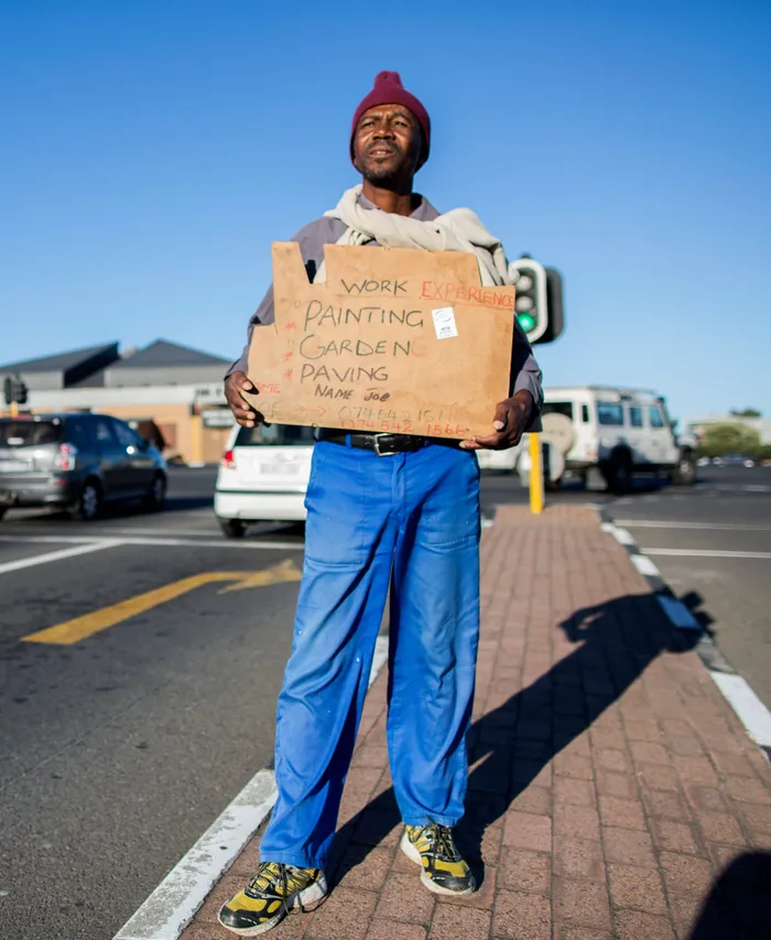 An unemployed man looks for work at a traffic light intersection in Cape Town with a sign saying painting, gardening and paving. An unemployed man holds a self-made advertising board offering his services at a traffic intersection in Cape Town. Picture: Nic Bothma EPA