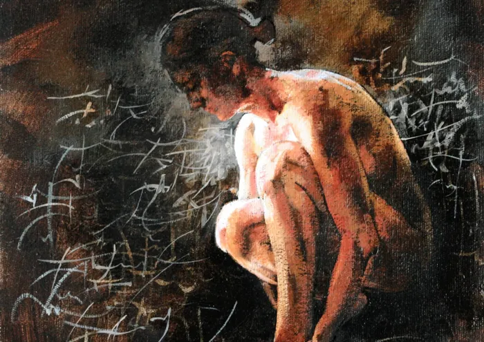 Referring to her work in this exhibition, she says: “I don’t see any direct and specific symbols in my work, but rather paintings made of marks and images that strike certain emotional chords. The works I have done deal with the human form and the art of mark-making. I have attempted to investigate how something as simple as a mark can evoke an emotion… I have examined how human posturing can trigger emotional responses.”