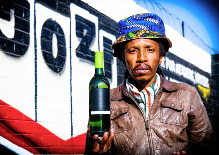 419 25.06.2014 Young artist Happy Dhlame pose with a bottle of wine, that shows his a painting branded on it, which is titled Blackjack in the limited edition of wine. Picture: Motshwari Mofokeng 419 25.06.2014 Young artist Happy Dhlame pose with a bottle of wine, that shows his a painting branded on it, which is titled Blackjack in the limited edition of wine. Picture: Motshwari Mofokeng