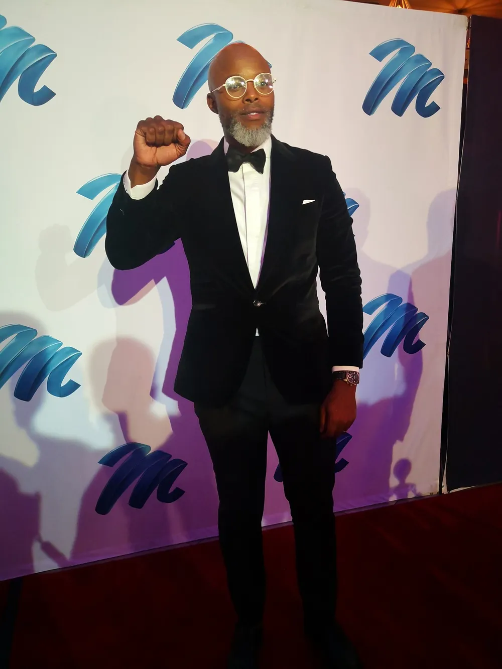 Thapelo Mokoena wore a velvet tuxedo jacket, a hand tied bowtie and white framed spectacles.