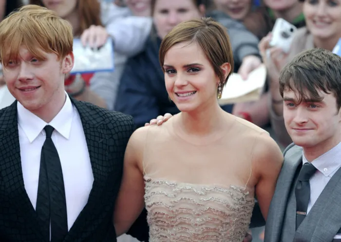 Actress Emma Watson poses with actors Rupert Grint (left) and Daniel Radcliffe (right) at the world premiere of ‘Harry Potter and the Deathly Hallows - Part 2’ in Trafalgar Square, in central London. Picture: Reuters