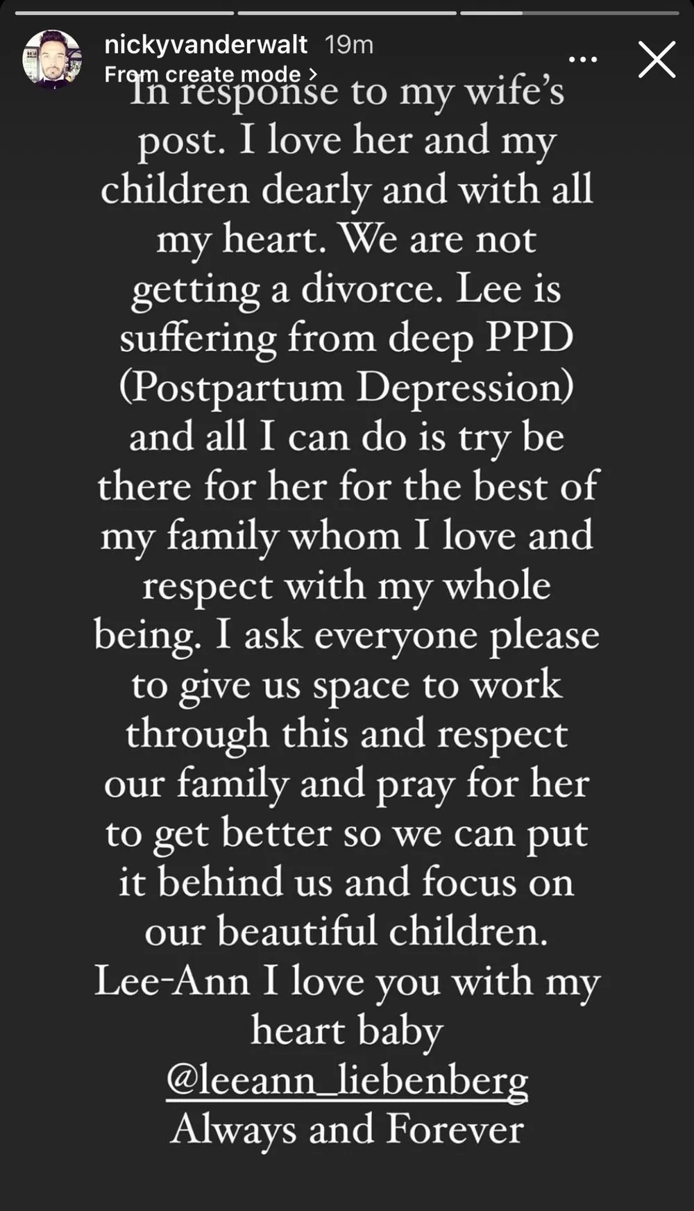 "I ask everyone please to give us space to work through this and respect our family and pray for her to get better so we can put it behind us and focus on our beautiful children. Lee-Ann, I love you with all my heart."