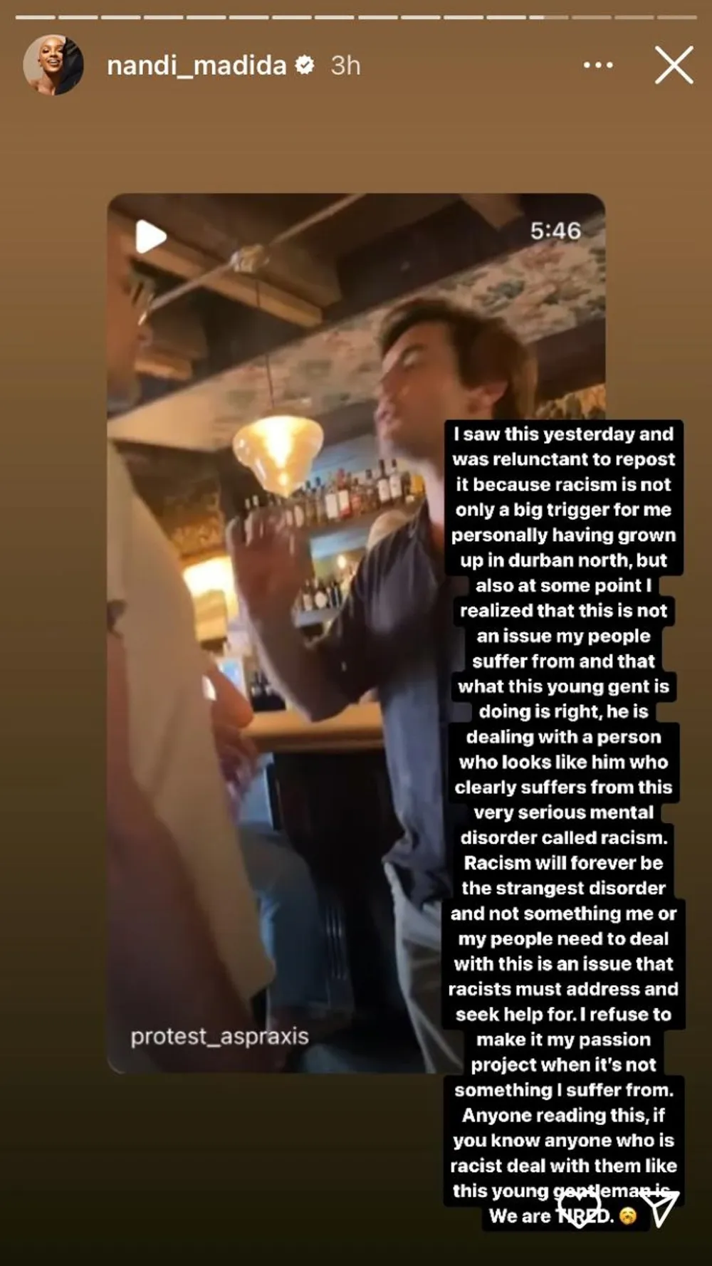 Appalled by the incident, singer and actress Madida reposted the video on her Insta Stories and wrote: “I saw this yesterday and was reluctant to repost it because racism is not a big trigger for me personally - having grown up in Durban North, but also at some point, I realised that this is not an issue my people suffer from.”