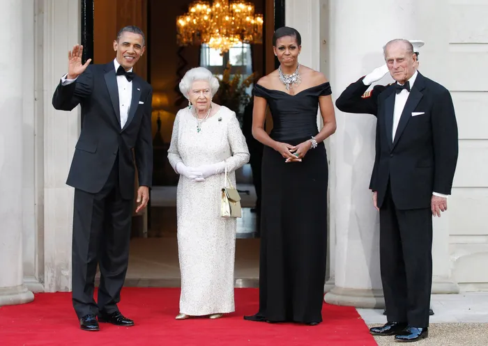 FILE@ In this May 25, 2011 file photo President Barack Obama and first lady Michelle Obama welcome Britain's Queen Elizabeth II and Prince Philip for a reciprocal dinner at Winfield House in London. AP Photo/Charles Dharapak, File