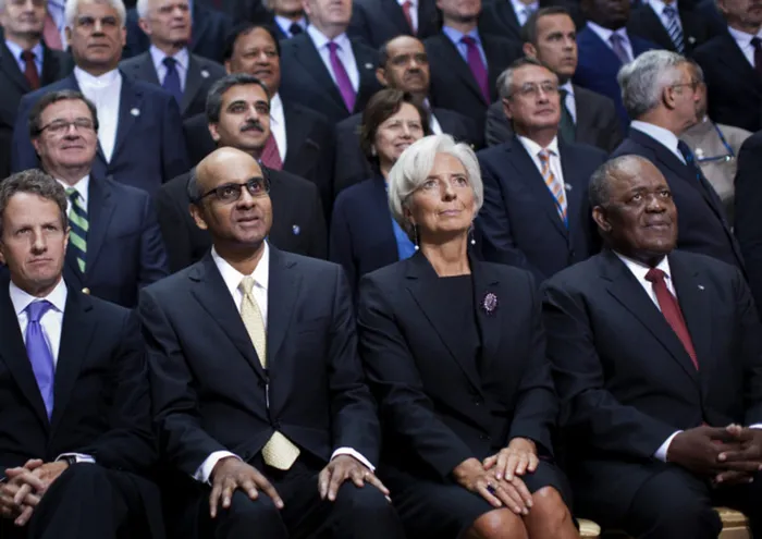 US Secretary of the Treasury Timothy Geithner, left), Singapore's Minister of Finance and IMFC Chairman Tharman Shanmugaratnam, second left, IMF Managing Director Christine Lagarde, second right, Hubert Ingraham, Prime Ministerr of the Bahamas and Chairman of the World Bank/IMF Group, and International Monetary Fund governors at annual International Monetary Fund and World Bank meetings in 2011. US Secretary of the Treasury Timothy Geithner, left), Singapore's Minister of Finance and IMFC Chairman Tharman Shanmugaratnam, second left, IMF Managing Director Christine Lagarde, second right, Hubert Ingraham, Prime Ministerr of the Bahamas and Chairman of the World Bank/IMF Group, and International Monetary Fund governors at annual International Monetary Fund and World Bank meetings in 2011.