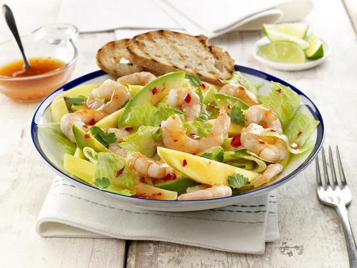 For a super-quick and summery salad (even though we are in autumn) try matching prawns with mango and drizzling over a punchy lime juice dressing