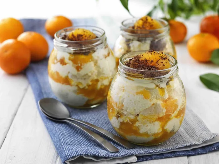 Place a few pieces of meringue in the base of your jars and then a spoonful of fruit cream. Add a couple of segments of fruit and a drizzle of sauce.