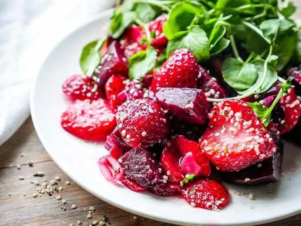 Top arugula with beet-dressing mixture; toss well. Top with the strawberries and then with Boursin cheese. Sprinkle with savoury trail mix. Serve immediately.