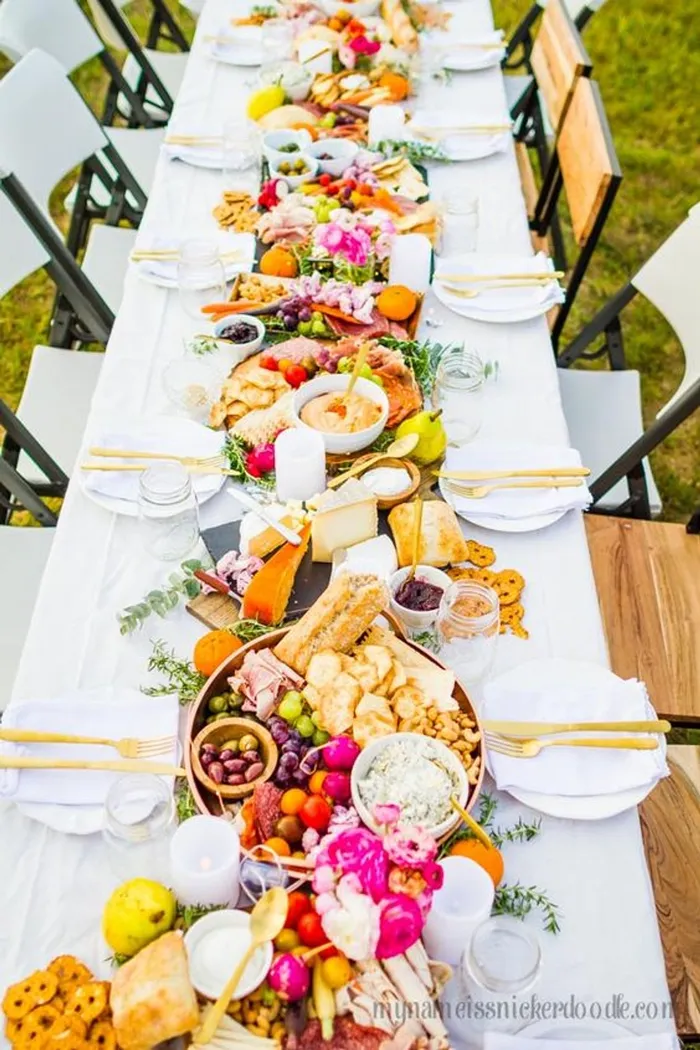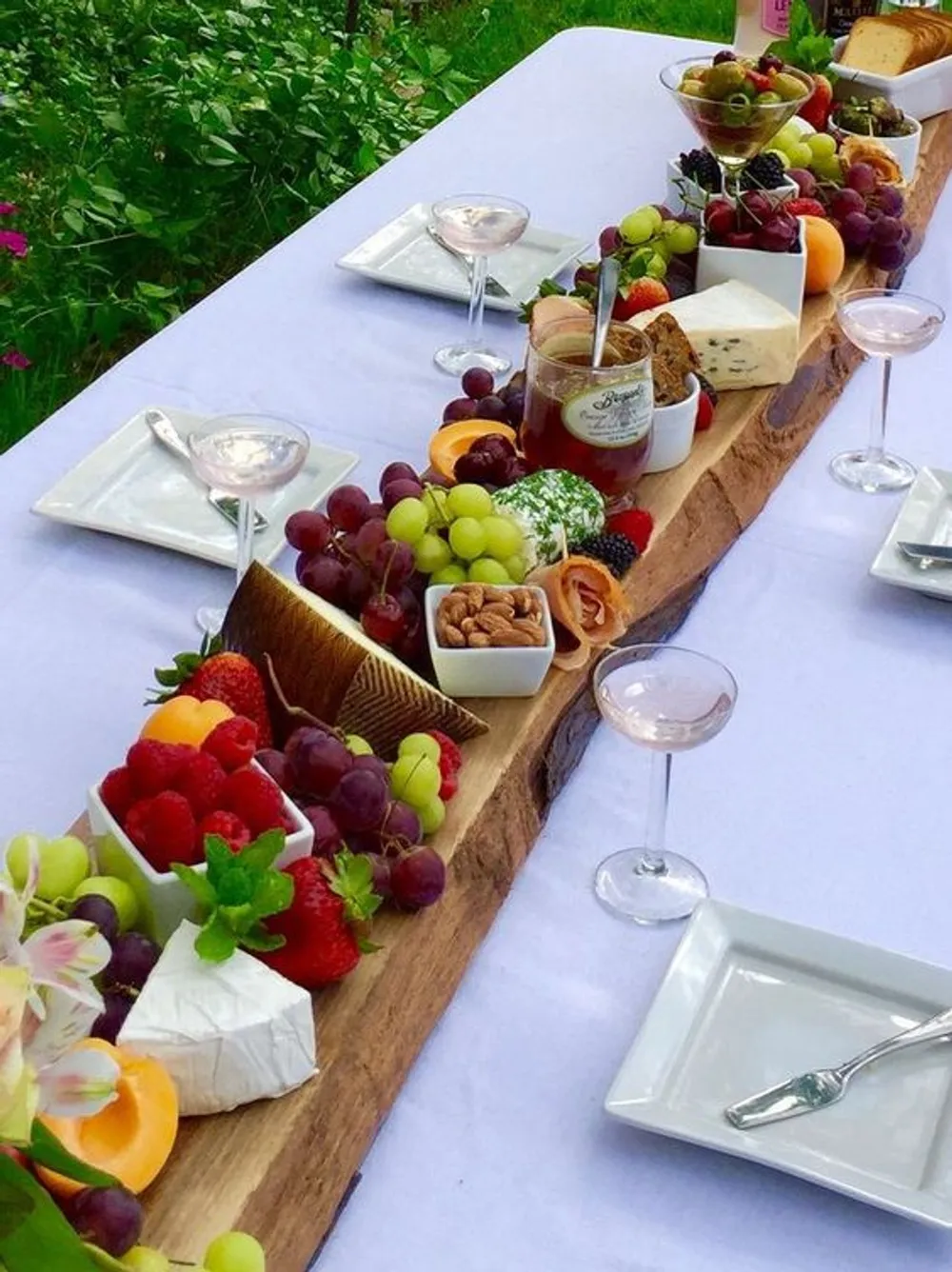 Cheeseboards of all sorts have been popular for some time so why not make them into the focal point of your party decor? Place brown paper across the length of your table or enough wooden boards to cover its length. The boards should be narrow as they need to appear to be overflowing with an abundance of cheeses, grapes, dried fruit, biltong and preserves. Garnish with edible flowers for a pop of colour.