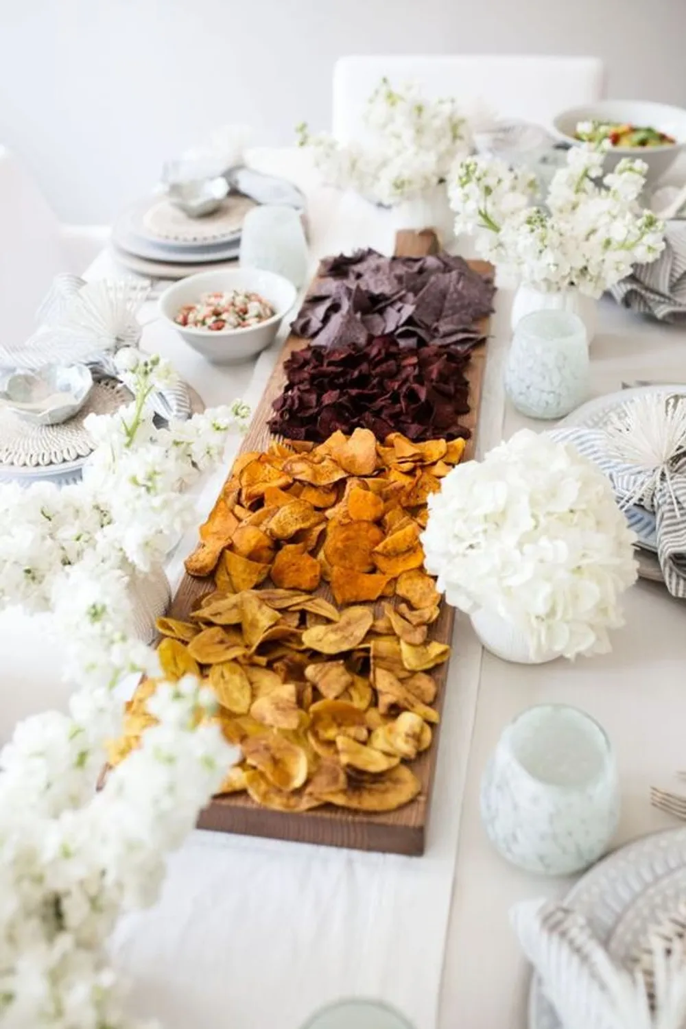 Take your hosting skills to new heights with a table runner you build yourself and then devour at the very end. This tablescape is ideal for movie nights, pre-drinks and house-warmings too. Cover the table with paper and spread out a good portion of nacho chips across its length.