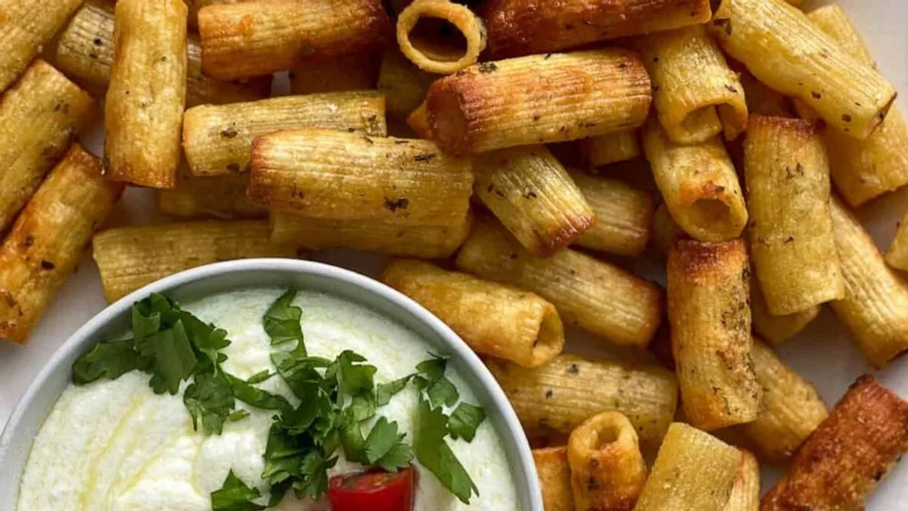 In @feelgoodfoodie’s video, it was Italian seasoning and garlic powder. Next, cook it in your airfryer at 200ºC for 10 minutes, tossing it halfway through. If you don’t have an airfryer, the foodie comments that you can bake your pasta in the oven at 200ºC for 20 to 25 minutes, tossing halfway through. However, she also notes that the result will not be as crispy. @feelgoodfoodie then prepared a whipped feta dip by combining feta cheese, Greek yoghurt, garlic and olive oil in a food processor. Lastly, garnish with some tomatoes and maybe some coriander, and you are ready to snack.