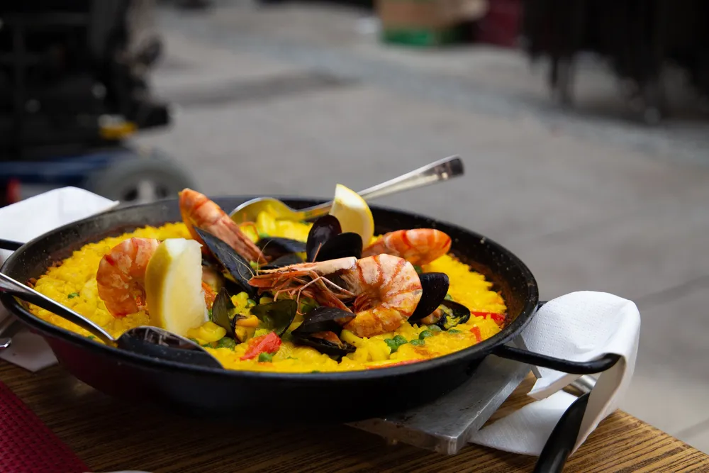 You then spread the rice – preferably the starchy and absorbent Valencia variety – across the paella pan (a flat, round pan that allows the rice mixture to cook evenly).