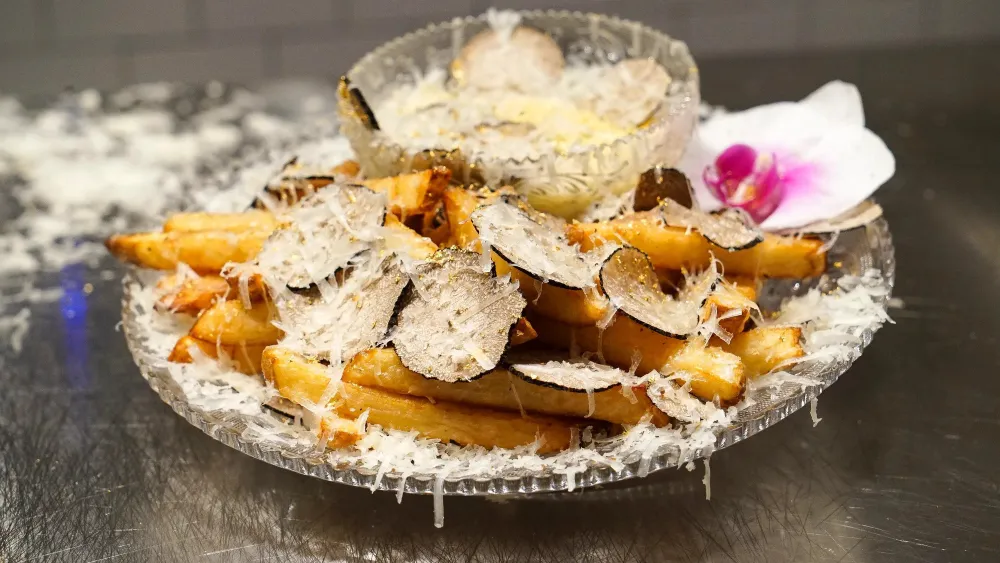 After they are cooked, the fries are seasoned with Guérande truffle salt, which is hand-harvested from Guérande, France, and then tossed in Urbani summer truffle oil. They are then topped with shaved pecorino tartufello cheese that is made of milk from sheep on the clay-rich hills of the Italian region of Crete Senesi. The fries are also topped with shaved black summer truffles from Umbria, Italy. Served on a crystal plate, the fries are finally finished with 23-carat edible gold dust and a sauce on the side.