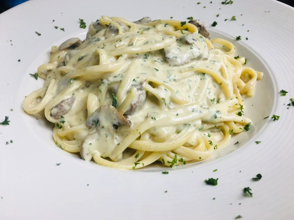 Creamy chicken and mushroom linguine: an easy dinner idea when you're not sure what to make