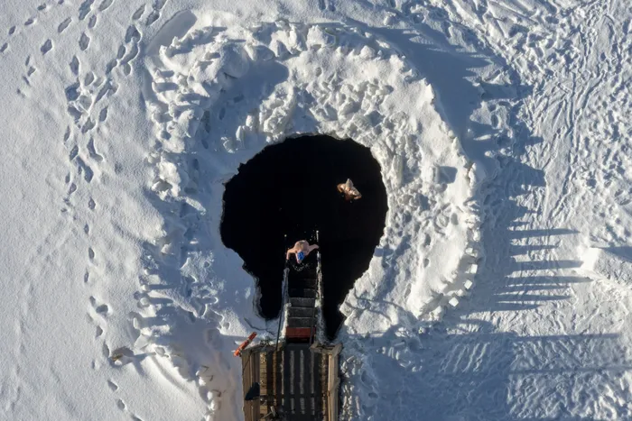 Two people take a cold bath in a lake after a sauna session in Rovaniemi. Picture: AFP