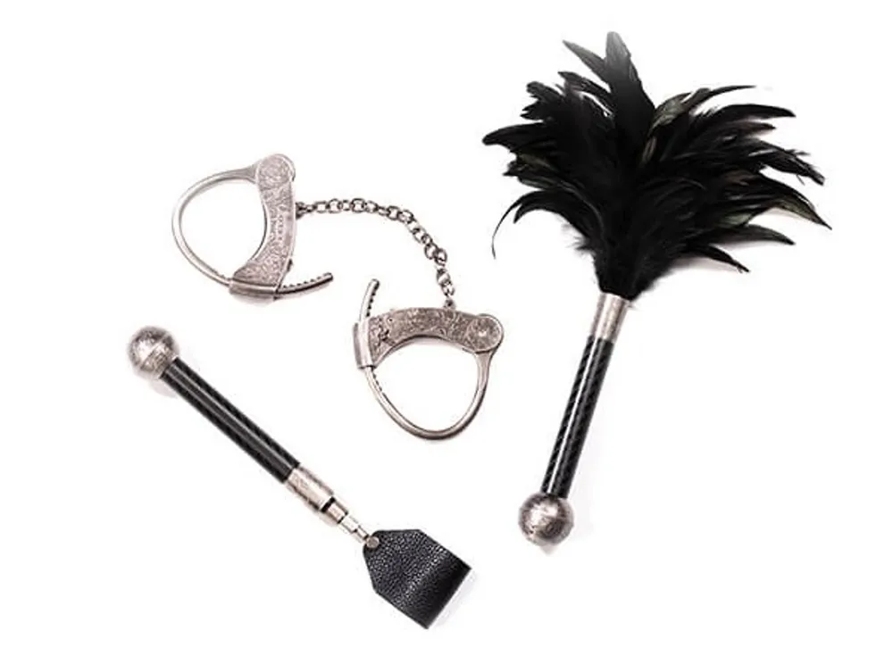 So, what does this pleasure chest contain? For those who want to explore their kink side, there’s a leather blindfold and leather Kie Eye Mask, handcuffs and a feather teaser.