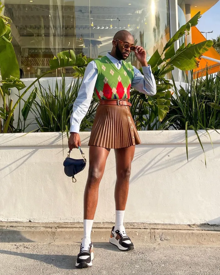 It wasnβt the first time Mnisi rocked a miniskirt. I mean, with legs like his, it would be a crime if he didnβt show them off and teach the haters that clothes are non-binary.