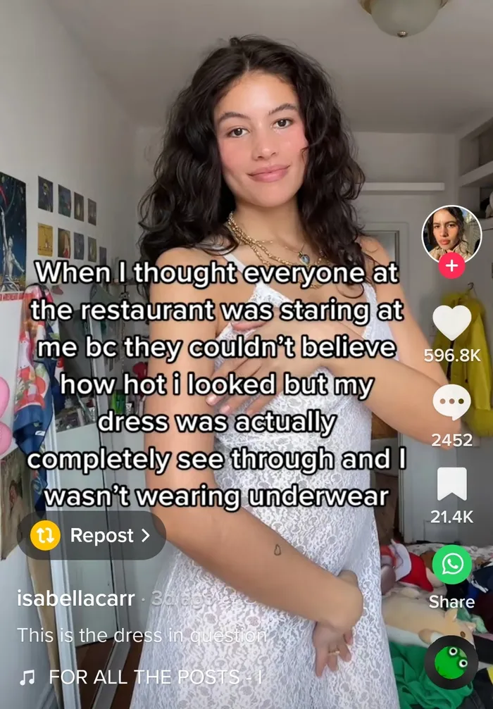 Taking to TikTok, Isabella Carr posted a video of herself showing off the white-lace dress while covering her breasts, with the accompanying blurb, “When I thought everyone at the restaurant was staring at me because they couldn’t believe how hot I looked. But my dress was actually completely see-through and I wasn’t wearing underwear.”