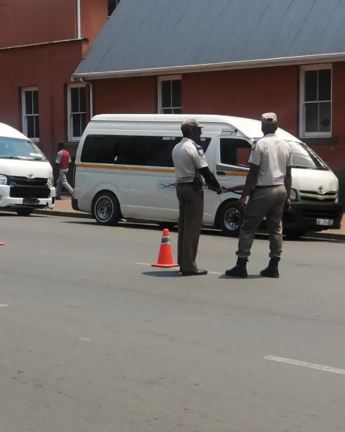 Two traffic officers stand next to an orange beacon near a minibus taxi. Pietermaritzburg residents believe that the location of traffic officers at key intersections in the city could help deal with the congestion caused by load shedding. File Picture: Supplied.