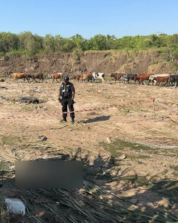 A policeman stands in a dry river bed beside barrier tape, as cattle file past behind him. The body of 23-year-old herdsman Thembinkosi Sihle Sibandze was discovered in Ottawa north of Durban on Tuesday. He went missing while attempting to cross a river during last month’s storm. Picture: Reaction Unit South Africa (Rusa)