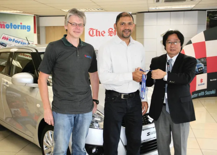 Imraan Wajodeen (centre) accepts the keys to the Suzuki Swift on behalf of his wife Shamin. He is congratulated by Yukio Sato, managing director of Suzuki Auto South Africa (right), and Denis Droppa, Motoring Editor of The Star. Picture: Minesh Bhagaloo Imraan Wajodeen (centre) accepts the keys to the Suzuki Swift on behalf of his wife Shamin. He is congratulated by Yukio Sato, managing director of Suzuki Auto South Africa (right), and Denis Droppa, Motoring Editor of The Star. Picture: Minesh Bhagaloo