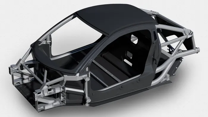 Dunsfold, Surrey - This is the latest version of Gordon Murray’s radical iStream automotive manufacturing system, which uses a high-strength aluminium frame with carbon-fibre outer panels to create a body-shell half the weight of one welded together from dozens of sheet-steel pressings.