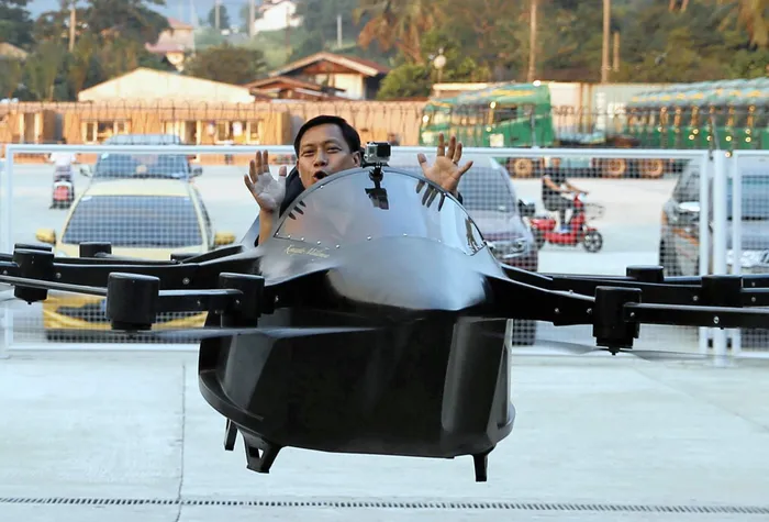 Former dancer and camera operator Kyxz Mendiola flew and hovered for a few minutes in a single-seater aircraft powered by the “multicopter” technology commonly used in small unmanned drones.