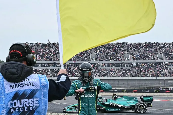 A race official waves the yellow flag as Aston Martin driver Lance Stroll leaves the track during the recent Chinese Grand Prix .