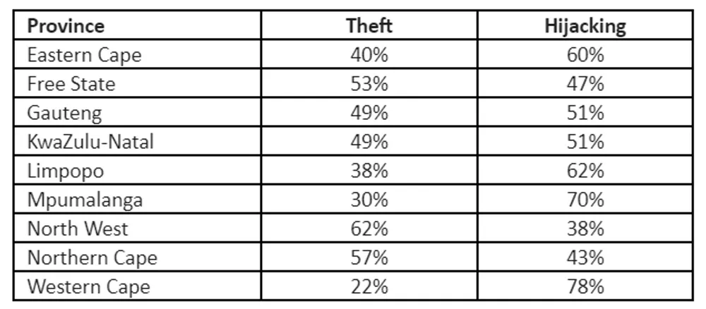The Western Cape is the province that sees the highest number of hijackings in relation to the thefts, however at 78% to 22%. This is followed by Mpumalanga (70/30), the Eastern Cape (60/40) and Limpopo (62/38), while Gauteng and KZN are tied at 51/49.