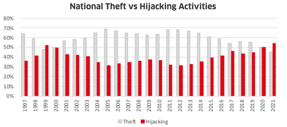According to this historical data the ratio between theft and hijacking has shifted dramatically in the past 25 years. In 1997 theft accounted for around 63% of all vehicle crimes, while hijackings represented around 37%. Hijackings currently account for 54%, versus 46% for thefts.