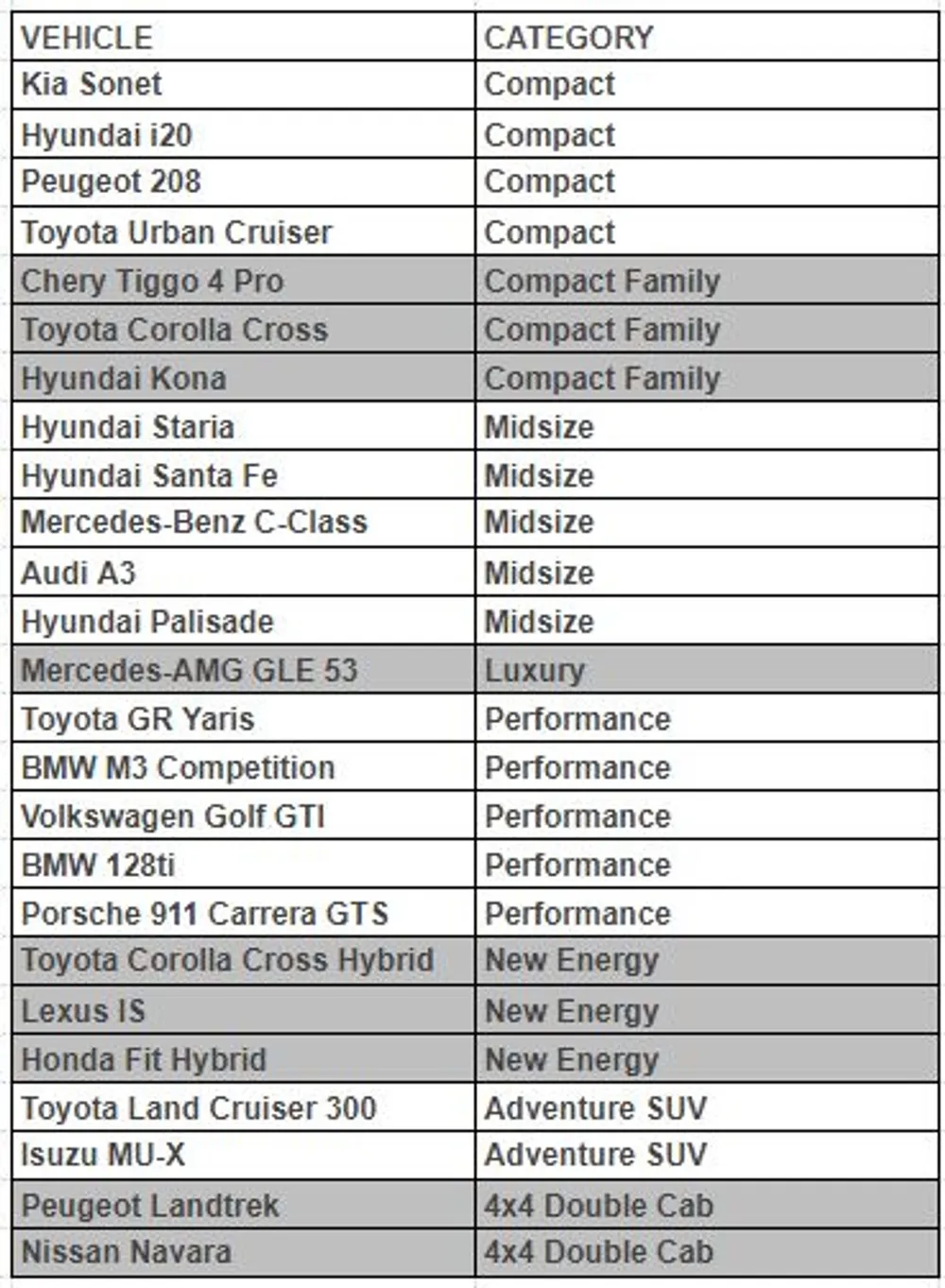This year’s competition has eight categories, which are: Compact, Compact Family, Midsize, Luxury, Performance, New Energy, Adventure SUV and 4x4 Double Cab.