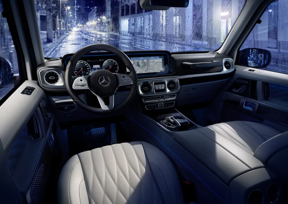 The G400d comes in AMG Line guise, with flared wheel arches over black 20-inch AMG multi-spoke light-alloy wheels, AMG design elements in the bumpers and an exterior protective strip with brake callipers with Mercedes-Benz lettering. It also sports a standard-fit Night Package that gives it darkened lights as well as mirror covers, a spare wheel ring and design elements in the bumpers in obsidian black and tinted rear windows.