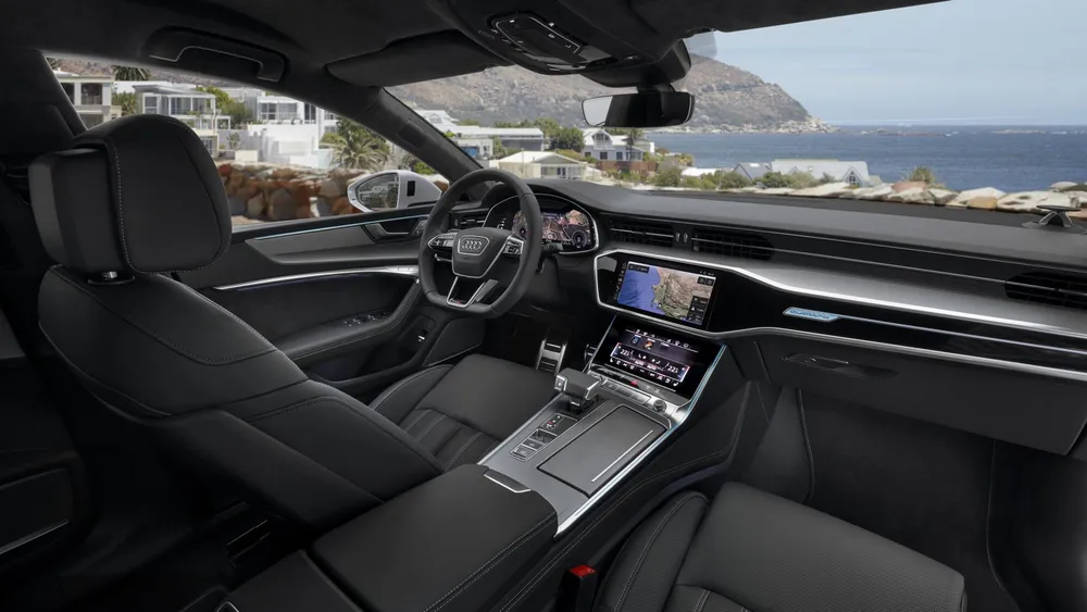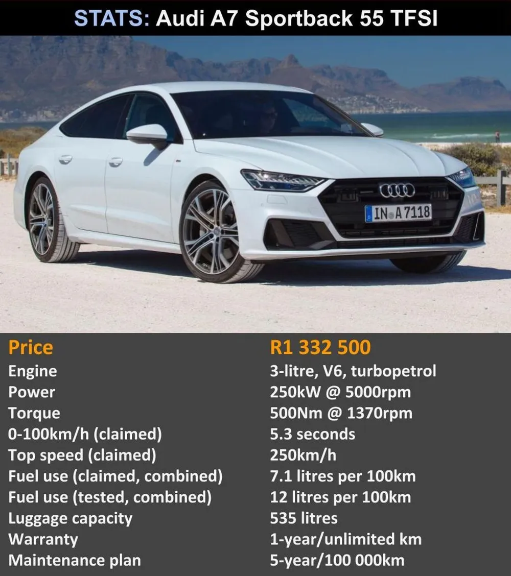 Like most of the latest Audis on sale in South Africa, the A7 Sportback is brimming with cool stuff. Like the system ushered in on the Q8 a couple of years ago, the A7 sports a new MMI touch response operating concept. It replaces the rotary push-button and the conventional buttons and controls of the previous model with two large, high-resolution touch displays. The driver controls the infotainment system from the upper display. Mounted on the centre tunnel, the secondary lower display provides access to the climate control system, comfort functions and text input. Drivers can rest their wrist on the automatic transmission’s wide selector lever knob. Audi also offers an optional head-up display that projects important information onto the windshield and MMI navigation plus also includes the Audi virtual cockpit system with a screen in the instrument binaccle instead of traditional, analogue speedo and rev-counter.