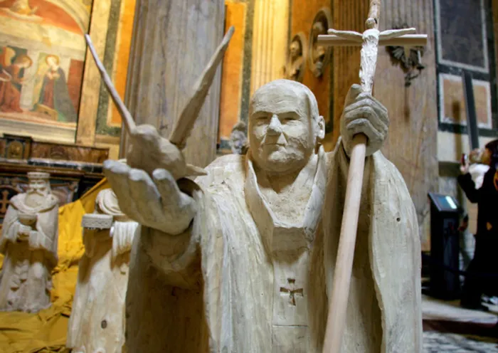 A visitor takes a picture of a wooden figure representing the late Pope John Paul displayed in Rome's Pantheon A visitor takes a picture of a wooden figure representing the late Pope John Paul displayed in Rome's Pantheon