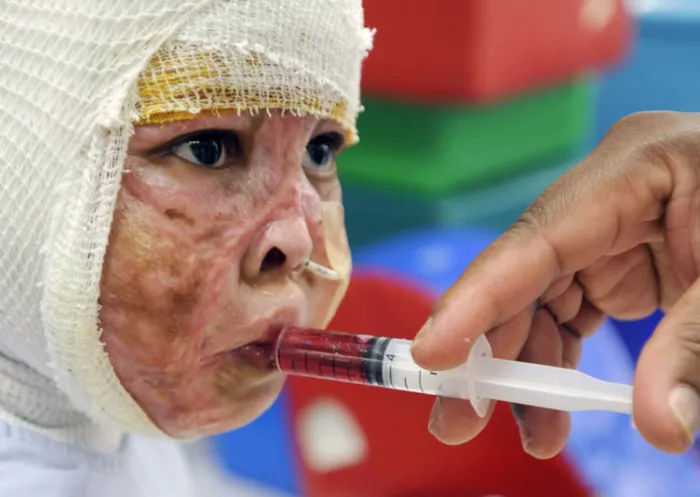 Cape Town - 120821 - Michelle is fed her daily medicine - Michelle Motibi, 5, from Wallacedene suffered from flame burns to 86% of her body after she was in a shack fire. Michelle was basically written-off, not expected to survive, but according to doctors her fighting spirit pulled her through. She has been in the ward for the past 4 months. She is undergoing treatment at Red Cross Children's Hospital's burn unit - Photo: Matthew Jordaan Cape Town - 120821 - Michelle is fed her daily medicine - Michelle Motibi, 5, from Wallacedene suffered from flame burns to 86% of her body after she was in a shack fire. Michelle was basically written-off, not expected to survive, but according to doctors her fighting spirit pulled her through. She has been in the ward for the past 4 months. She is undergoing treatment at Red Cross Children's Hospital's burn unit - Photo: Matthew Jordaan