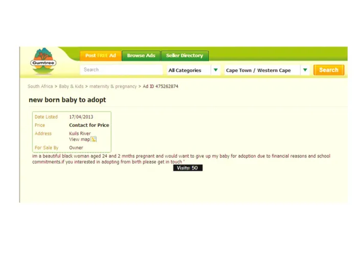 Meanwhile, the Department of Social Development has appointed officials to monitor classified advertising websites. MEC Albert Fritz has said the Children’s Act prohibited advertising the adoption of babies and children, and that the advert could be likened to child trafficking.