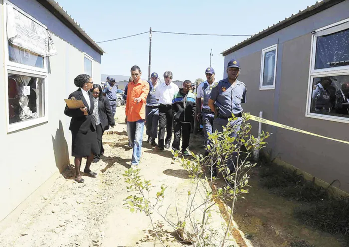 Swellendam. 131009. Day 3 of the Anene Booysen courtcase in Swellendam. Today was the incident site visit of the rape and subsequent death of Anene. Johannes Kana's attorney, Pieter Du Toit, Judge Patricia Goliath, Witness Chrisna Mentoor and State Prosecuter Maria Marshall. The Pub where Anene left from and the scene where her body was found pictured. Wikus Kiewitz, from ambulance services that collected anene's body points out to the inspection team where he found her. Johannes Kana in tow. Reporter Barbara Maregele. Picture COURTNEY AFRICA Swellendam. 131009. Day 3 of the Anene Booysen courtcase in Swellendam. Today was the incident site visit of the rape and subsequent death of Anene. Johannes Kana's attorney, Pieter Du Toit, Judge Patricia Goliath, Witness Chrisna Mentoor and State Prosecuter Maria Marshall. The Pub where Anene left from and the scene where her body was found pictured. Wikus Kiewitz, from ambulance services that collected anene's body points out to the inspection team where he found her. Johannes Kana in tow. Reporter Barbara Maregele. Picture COURTNEY AFRICA