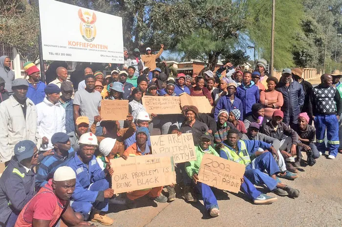 A group of 45 artisanal miners protested outside the Koffiefontein Magistrate’s Court on Wednesday after they were arrested for trespassing and malicious damage to property. Picture: Norma Wildenboer A group of 45 artisanal miners protested outside the Koffiefontein Magistrate’s Court on Wednesday after they were arrested for trespassing and malicious damage to property. Picture: Norma Wildenboer