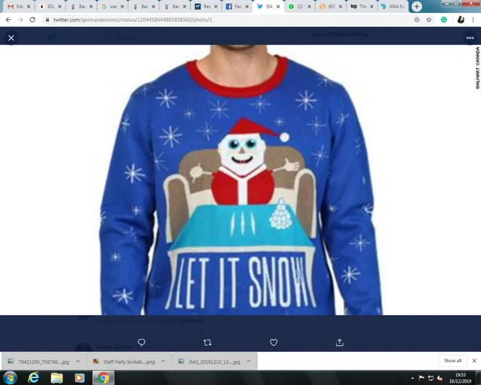 The retail giant also issued an apology over a sweater offered by third-party seller FUN Wear that featured an image of a bug-eyed Santa Claus seated in front of three white lines that appeared to be cocaine. The sweater's tagline: "LET IT SNOW."