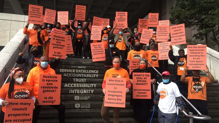 Good party members picketed outside the Cape Town Civic Centre carrying placards bearing questions that the municipality has refused to answer in the provincial legislature. Picture: Supplied
