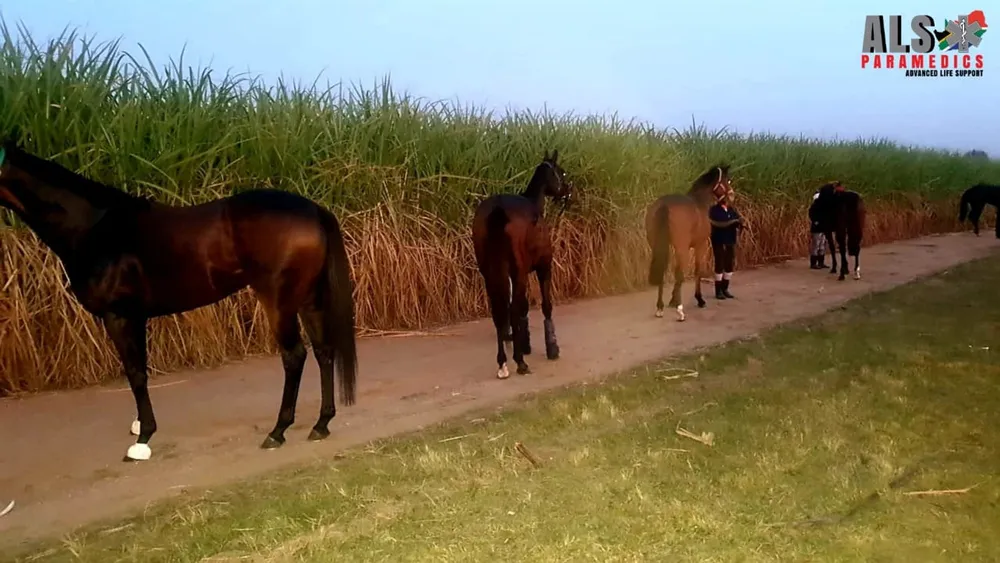 “The horses from the truck were uninjured in the accident and were taken back to the stables.”