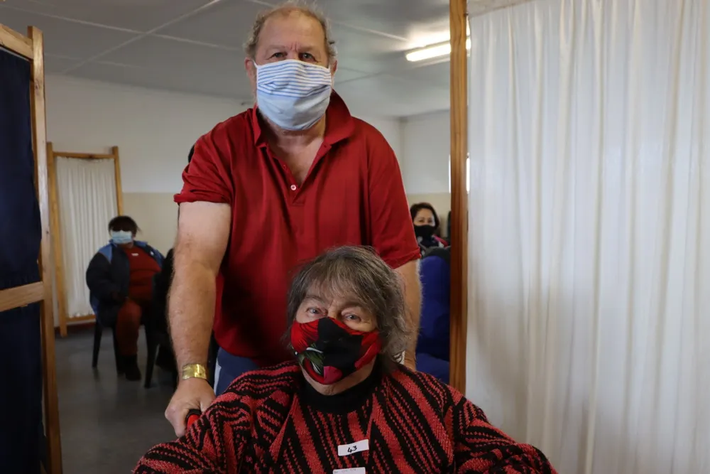 Farmer John Vermeulen, 62, visited the outreach site with his mother, Janette Vermeulen, 87, to receive their second dose of the vaccine. Vermeulen said he needed to get vaccinated to be able to care for his elderly mother and his family.