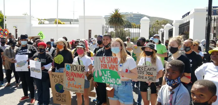 Demonstrators from various environmental organisations gather at Parliament to make their voices heard in the fight against the excessive use of fossil fuels, the release of unnecessary carbon emissions and other issues that lead to pollution and climate change. Picture: Armand Hough/African News Agency (ANA)