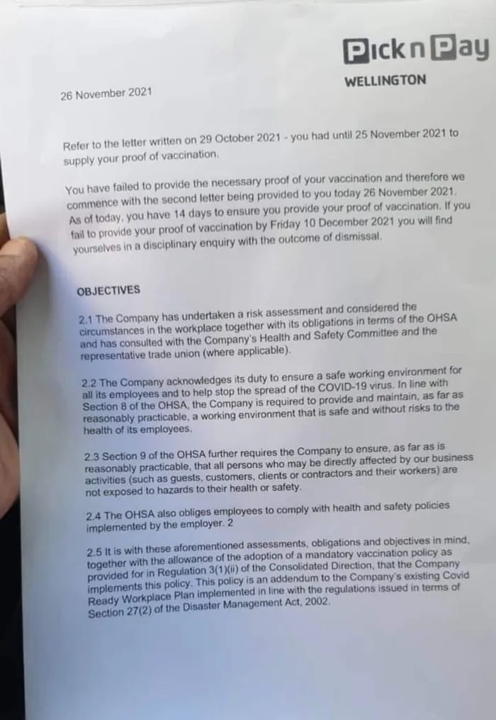 Kotzé said the letter created confusion and the impression that mandatory vaccination could be rolled out at Pick n Pay stores.