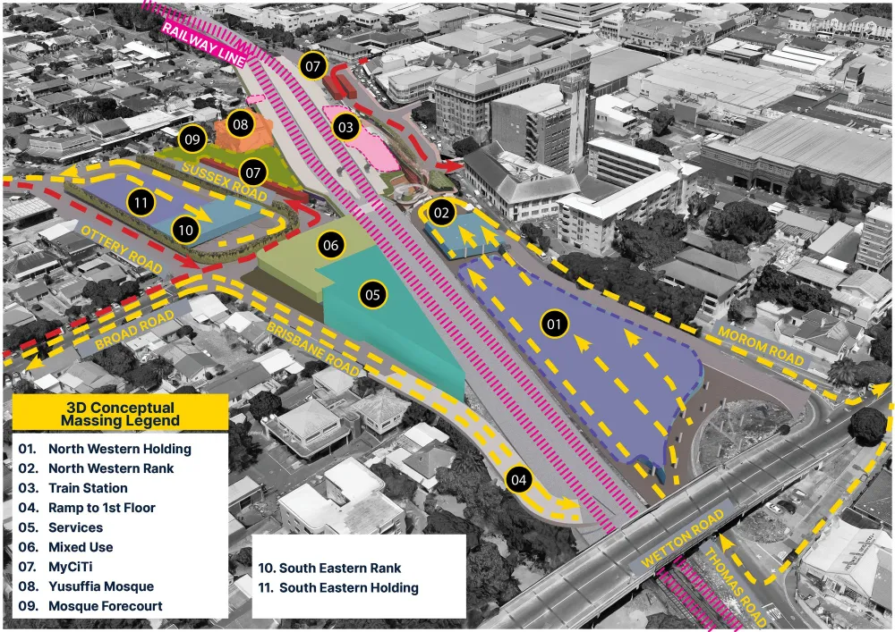 The design proposes two minibus taxi facilities located to the north and east of the Wynberg railway station and feature’s a new facility with two levels covering an area of approximately 25 000m².