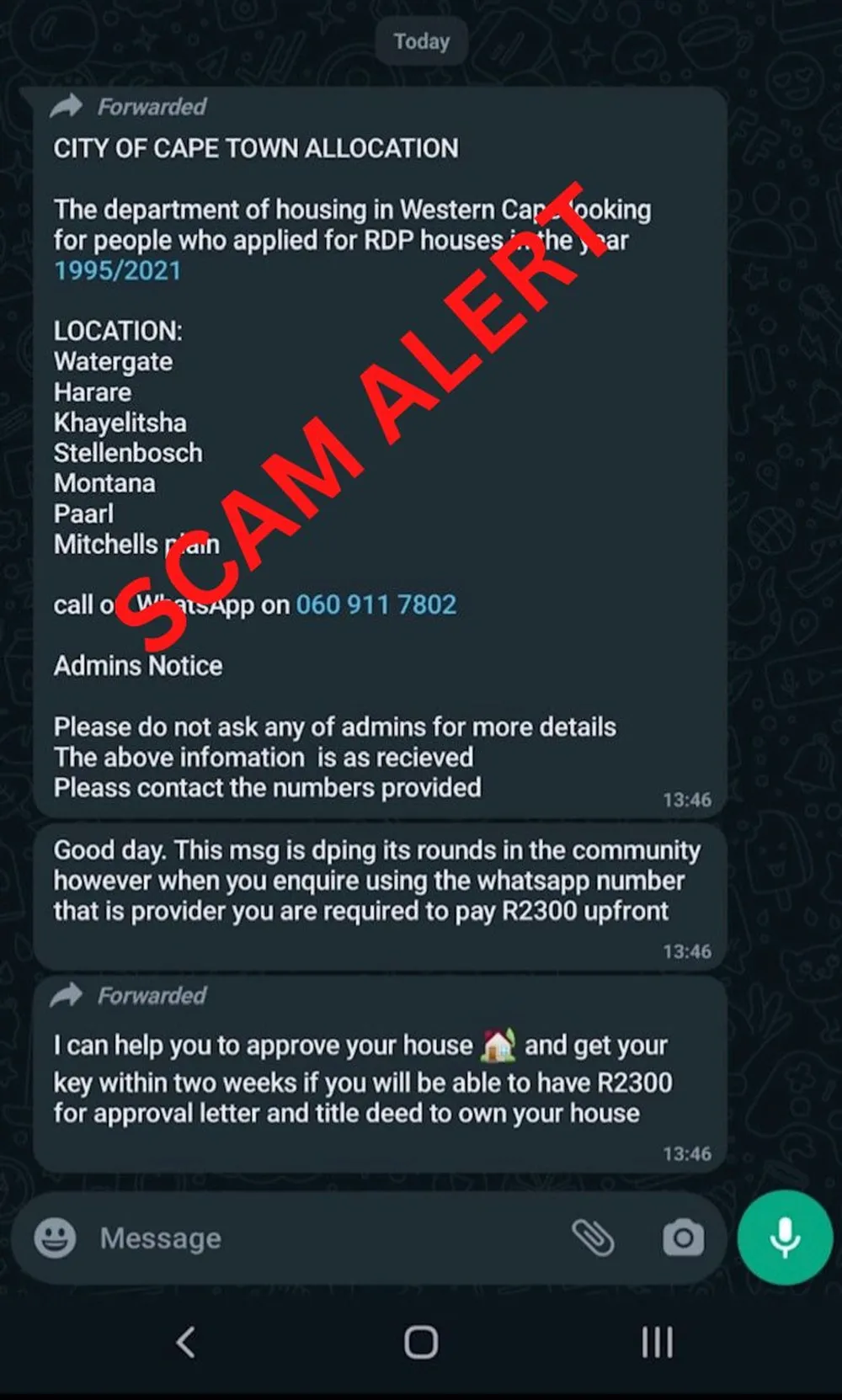 “The department recently learnt of a WhatsApp message that is being circulated, claiming to assist residents to receive a house within two weeks. Residents are then requested to pay R2 300 for the approval letter and title deed in order to receive a housing opportunity.”