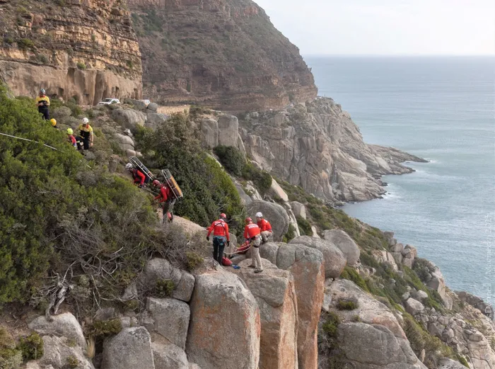 Wilderness search-and-rescue teams assist the police in recovering the body of a man who fell 20m to his death off Chapman’s Peak Drive, late on Sunday afternoon. | WSAR Simon McDonnell and Rob Burger